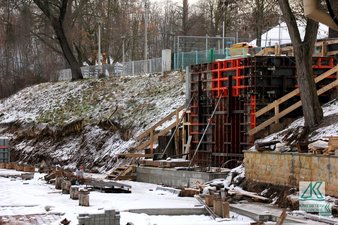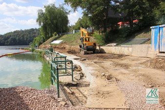 Am 20.7.2020 konnte dann endlich mit den Arbeiten begonnen werden. Kurz nach Baubeginn stellte sich heraus, dass trotz umfangreicher Baugrunduntersuchung die Tragfähigkeit für die Ramme zu gering war. Es musste zusätzlich eine 66 m lange mit Spundwandbohlen gesicherte Fahrspur eingebaut werden. Dies hatte erhebliche Auswirkungen auf den weiteren Aufbau der Promenade. Die Pflasterfläche der Promenade musste auf einer durchgängigen Betonplatte gegründet werden.