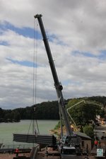 Der einsturzgefährdete Fähranlager wurde abgebrochen und neu errrichtet. 6 Stahlbetonfertigteile wurden auf 7 Rammpfählen aufgelegt und mit Beton vergossen. Gegenüber der ursprünglichen Länge von 24 m hat er jetzt eine Länge von 27 m (ohne Widerlager). Die Rammpfähle wurden am 17.8.2020 mit Freireiter und 400 t Autodrehkran eingebracht. Dieser Kran kam auch für den anschließenden Einbau der temporären Spundwand am Kassenhaus, für die Spundwand am Liegeplatz der Hainichen sowie am 2.10.2020 zur Montage der Stegfertigteile zum Einsatz. Der größte Teil der Spundwände wurde allerdings mit einer Mobilramme ABI TM 13/16 eingebracht, da mit dieser ein wesentlich präziseres Arbeiten möglich ist als mit einer freireitend am Kranausleger hängenden Ramme.